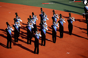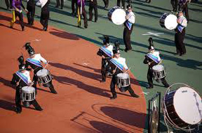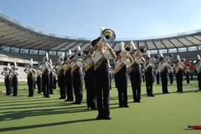 昨年11月の末、本稿を書いていたとき、吹奏楽に嵌っていることを知ったアメリカ在住の娘から「12月にドラムコーの日本大会があるから観に行くといいよ」、というメールを受けました。ドラムコー?最初は何のことだか全くわかりませんでした。さっそくインターネットで調べてみましたら、12月5日(日)に新横浜の日産スタジアムで第18回DCJ(ドラムコージャパン)全日本選手権大会が開催されることがわかりました。ドラムコーというのはDrum Corps のことで、打楽器と金管楽器、それにフラッグやライフル銃(ライフルに形を模した模擬品)を手にするカラーガード(Color Guard 元々は軍隊用語で軍旗を奉じる衛兵隊のこと)から成る音楽隊のことです。大会では、演奏される音楽を、その芸術性とテクニックに加えて、視覚的な面からもとらえる高度なパフォーマンスのようで、ミュージックエフェクト、ビジュアルエフェクトなど8項目の審査基準にしたがって厳密に採点され、得点を競い合うようです。マーチングバンドとどう違うの、と問われても答えに窮してしまいますが、よくはわからないのですが、ドラムコーはマーチングの一形態ではあるけれど、元々が軍隊の鼓笛・信号隊から始まったという起源の違いから一線を画しているようです。とはいえ、特定の基準で審査されるとか年齢制限があるいう点を除けば、内容的には大きな違いはないのでしょう。アメリカでは、毎年全米選手権が、そして3年に一度は世界選手権も開かれ、数万人を収容するスタジアムを一杯にするほど、たいへんな人気のようです。娘も2007年にパサデナで行われた大会を観たそうで、その感激からわたしにも観るようにメールしてきたのでしょう。
