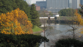 霞が関の西どなり、ちょっとした小高い台地が永田町です。霞が関からは外務省横の潮見坂を上がったところで、広重の絵に描かれた「霞かせき」はこの坂のことです。台上には往時、彦根藩井伊家の上屋敷、広島藩浅野家中屋敷、その他江戸城西の要として旗本屋敷なども多数ありました。井伊家は明治新政府にとっては仇敵そのもの、維新後、屋敷は取り除かれ跡地は参謀本部・陸軍省といった陸軍の官衙、各種兵営・練兵場などによって占められました。しかし丸の内同様に軍施設が他へ移ったあとの大正期になって、国会議事堂建設地と定まり、広大な敷地は三分割され、旧浅野家屋敷跡に議事堂が建ちました。旧井伊家跡などは国会取り付け道路を挟んで、北と南とに二分割され、北側は参謀本部などを経て、現在は国会前庭洋式庭園となり、南側は有栖川宮家の邸宅、宮内庁霞が関離宮、東宮御所などを経て、現在は和式庭園として各々一般公開されています。
