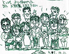 「まらうと」に残されたイラスト 彼女たちの仲間が「まらうと」に残してくれたのは、むろん山荘へ招いてくれたことへの謝意、非日常的な山荘での休日の楽しさなどを書いてくれていますが、やはり若者たちにとってはイラストが付きものとなります。上掲のイラストなどずいぶんくわしく描かれており、「絵日記と間違えてすみません」と付記されていてほほえましいものがあります。「まらうと」には来荘した日付、写真に加えて、こうした画も加わるようになり、いまでもひもとくことによって、そのときの様子がよくわかり、たいへん楽しい読み物になっており、記録だとも言えるでしょう。あらためて目を通してみると、わたしが思っていた以上に娘たちがよく利用していたことがわかります。年齢差から考えて当然のことながら、上の娘はずいぶん利用していました。それだけに、山荘に対する思いも深かったにちがいありません。できれば山荘も残して「まらうと」も(三)、(四)……、と受け継いでほしかったのですが、それができなかったこと、いまさらながら自分の甲斐性のなさに、忸怩たるものがあります。