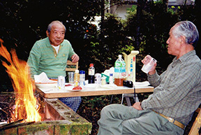 焚火を囲んで酒量も急ピッチ 学友というのはわたしの関係ですが、そんなには声をかけていません。じつは山荘に招いたわけではないのですが、北麓の高原でゆくりなくも、大学で机を並べた友人2人に会っています。山荘を購入して間もないころ、妻と上九一色村との境界に近い樹林帯を散策していた際、家族と山登り姿で登ってくるI君に出会ったのです。教室では学籍簿が近かったため、顔だけはたがいによく知っていました。京王の別荘地に父親が購入した山荘があり、山歩きがてらそこまで歩くのだと言っていました。もう一人は、設備事務所を主宰していた彦坂満州男君(故人)で、高原に山荘を構え、そこで富士鳴沢春秋会といった、多彩な建築集団間の意見交換会的なセミナーを開き、また、建築以外にも、音楽・舞台・工芸デザインなどの専門家を結集し、鳴沢村を舞台にステージ富士実験工房と称したイベントを開催していたようです。そこへは、わたしの知る学友も何人か参加していたことを耳にしていましたが、そばに住みながら参加できなかったこと、残念に思っています。一口に学友と言っても、一番気兼ねなくつき合えるのは、いわゆる「竹馬の友」ではないでしょうか。わたしはそう思っていますが、学友で山荘に招いたのは中学の友だけでした。なかでもAは、招くというより「一緒に出掛けよう」ということで、おっくうがってほったらかしたままの雑草や枯れ木の山を、来荘のたびにたんねんに片付け・整理をしてくれ、傾いたままのTVアンテナまで直してくれたものでした。3度来てくれたうちの2回は、拙宅に近いところに住む中学の恩師もご一緒で、二人はことのほか酒好き、一度なんか、10月の初めで夜になれば寒さを感じるというのに、焚火を囲んで、下戸のわたしをさしおき、夜が更けるまで飲みつづけたものでした。そのことを、先生は「まらうと」にこんなふうに書いています。「富士吉田の肉屋へ廻って馬刺しほか焼肉用の肉を仕入れる。ベル(河口湖町のスーパーの名)へもどって酒類・野菜などを買う。庭でバーベキュー。肉も酒も美味しくて、自分は飲みすぎた」。翌朝、先生は「昨夜はどのように寝たのか覚えていない」とおっしゃるのですが、体の大きな先生をどのように寝かしつけたのか、いまとなってはわたしも記憶は定かではありません。