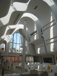 五十嵐太郎は、アンリの原宿教会について、神奈川新聞紙上でこう評しています。「正面を見ると、曲線を描くコンクリートのボリュームが印象的である。全体としては、波打つ太い天井を輪切りにして、六つの変形アーチを平行に配置したような構成をもつ。(中略)内部に入ると、壁の厚さゆえに温かく包み込まれる空間体験を味あう。モダンな外観ながら、意外にもロマネスク建築に通じる分厚いボリューム感を想起する。アーチ端部の天井が低いベンチも、西欧の教会の小空間をほうふつさせるのだ。一方で、真っ白に塗られた壁や、断続的に入るスリット(アーチの切れたすき間)からの光は、明るく透明感にあふれ、現代的な軽やかさをもっている。相反する二つのテイストが巧みに組み合わされた教会といえよう」 五十嵐のいうロマネスク建築とは、ヨーロッパにおいて11世紀から13世紀にかけての教会や修道院によく見られた建築様式のことです。中世のヨーロッパでは、民族の大移動以降、何世紀にもわたって民族間の争いがつづき、またキリスト教とイスラム教よる宗教間の対立も長くつづいて、まさに戦乱の時代でした。戦乱から逃れた、そして魂の救いを求めて巡礼となった人々が逃げ込んだのがロマネスク建築の教会であり、修道院だったのです。壁は厚く、小さい窓から差し込む光は弱く暗い室内、その中ではじめて、人々は安寧の気持ちが得られたのです。それからいえば、原宿の教会内部の明るいこと、「どこがロマネスク建築に通じるの?只ただ明るい現代的な教会ではないか」と、建築を見る目に欠けたわたしなど、はじめは、ついそう思ってしまいました。しかしよく見てみれば、コンクリートの壁は確かに厚いし、変形したアーチはロマネスク建築の特徴である半円形アーチに通じるかもしれません。五十嵐がロマネスク建築を想起させるという意外性も、案外当たっているのです。教会内ツアーの際、案内役の長老は、こんなことを話していました。「教会計画にあたっては、7人の建築家のコンペで設計者を決めました。最後の決め手になったのは、設計者のキリスト教への思い入れの深さだったのです」と。そして更に、「ゲイダンは、聖書をじつによく読み込んでいましたよ」とつけ加えられました。原宿教会内の空間にいることで安寧の気持ちが得られる点は、わたしのように信者ではない者にも十分感じられたのです。その意味では、まさにロマネスク建築を想起させるという五十嵐の評は当たっているといえるでしょう。ゲイダンは、その上で、さらにモダンな感じの軽やかさをもたせ、五十嵐のいう相反する二つのテイストが巧みに組み合わされた教会を生み出した、といえます。すばらしい作品だと高く評価したいと思います。
