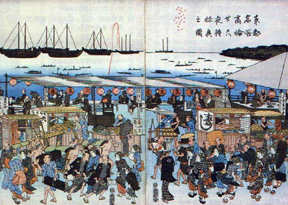 (注記2) 文中に入れた錦絵は、歌川広重の『高輪二十六夜待遊興図』(神奈川県立博物館蔵)で、他人の書き物からの孫引きである。寿司の屋台には、すでに握られた鮨が並べられており、醤油を入れていると思われる器も描かれている。東海道の道筋から海岸までかなりの広さがあって数多くの店が建ち並んでいることから、高輪の大木戸近く、細川家の蔵屋敷辺りの様子だと思われる。品川へこれから遊びに行く客を乗せた駕籠かきや、高輪東禅寺などの寺からこっそりと抜け出てきた僧侶らしき姿も見え、月を見に江戸府内から集まった多くの遊興客で賑わう様子がよく描かれている。