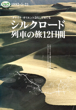シルクロード列車の旅ツアー・パンフレット 「なら・シルクロード博」は、ねむっていたわたしのシルクロードへの思いに火をつけてくれました。それから2、3年経ったころ、とある旅行代理店で「シルクロード列車の旅12日間」というツアー・パンフが目につきました。JR東日本の企画で、北京から空路で河西回廊最西端の町ウルムチへ飛び、そこから中国自慢の特別仕様「チャイナ・オリエント急行」で河西回廊を北京へもどる3,774キロの列車の旅というわけです。途中車内で4泊して車窓からシルクロードを眺め、3泊はトルファン、敦煌、そしてシルクロードの出発点西安などの拠点で下車して名所・旧跡を訪ね、市内の高級賓館(ホテル)で泊まる、という豪華なツアーでした。わたしは食指が動きました。何よりも、列車や市内の高級賓館ならばトイレの心配はないだろうという思いからでした。ちょうどそのころ中国・天津で工事引き合いの話しがあり、現地調査に行った人から「トイレのひどさには参った」と聞いていましたので、痔もちのわたしにはウォシュレット付トイレが必須の条件だったからです。といっても仕事の都合で、おいそれと参加するわけにはいかず、「悠久のロマンであるシルクロードは逃げやしない」、と自分の思いを封じ込んでいました。いつかチャンスはめぐってくるさ、自らをなぐさめるうちに年月は過ぎ去っていくばかりでした。2002年には、連れ合いの方が「俳画教室」の仲間と一緒に写生ツアーで一足先に訪中をして、西安で兵馬俑を観て感激し、大同の雲崗石窟などの見学を楽しんで来ました。中国へ足を踏み入れたことのないわたしにとっては、うらやむ気持でいっぱいでした。