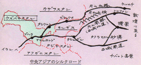 中央アジアのシルクロード シルクロードとの係わりは、思いもかけないことで三度訪れました。2005年の夏になって、中央アジア・ウズベキスタンの首都タシケントへ訪問することになったのです。中央アジアへの訪問ははじめてのことで、正直に申してまったく土地カンがなく、ソ連のアフガニスタン侵攻時、山々がつらなるアフガニスタンへ重い戦車がどこから入ったのだろう、と以前から不思議に思っていたほどです。実際に行ってみて、当地の地図をまざまざと眺めていますと、ソ連邦解体以前の中央アジア諸国はソ連領であり、アフガニスタンとは国境を接していたことがわかります。アフガニスタンへはウズベキスタン最南端の町テルメズでアムダリヤ川の深い渓谷にかかる橋梁を渡って侵攻したようです。ちなみに、ブッシュ大統領のアフガニスタン侵攻もその橋からで、その当時は、ウズベキスタンはアメリカの軍事基地化していたそうです。そこまでわかったところで、さらに調べてみますと、冒頭でふれた玄奘三蔵法師の天竺入りもほぼこのルートだったのです。