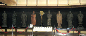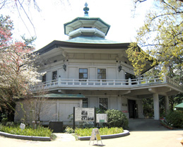 八聖殿内部 当初わたしは、八聖殿は本牧三溪園の敷地内にあるのではと誤解していました。実際には、三溪園と本牧市民公園に囲まれた本牧臨海公園の丘の上に建っています。いわば谷あいの住宅地を隔てて三溪園と東西に向かい合ったところに位置しています。本牧というところ、元々風光明媚なところで、江戸時代から文人・墨客に愛され、北斎なども絵を遺しております。ペリー来航時には防備の拠点になり、遠見番所になったようです。八聖殿が昭和8年(1933年)に建立されるに至った経緯は、説明書によれば、大正末から昭和にかけて逓信大臣や内務大臣を務めた政治家安達謙蔵が、世界中から8人(日本人・外国人各4人)の聖人を選んでその像を法隆寺の夢殿に模した八角堂に安置し、八聖殿と命名されて精神修養の道場としたのだそうです。正直なところ、修養の道場とは何をするところなのか、そして横浜の出身でもない安達なのにどうしてこの地が選ばれたのかなど、わたしには理解できないのですが、昭和12年(1937年)に横浜市に寄贈されるまで、各界を代表する人物による各種の講演会場になっていたようです。現在の名称、横浜市八聖殿郷土資料館となったのは昭和48年(1973年)ですが、戦中を含めて昭和12年からの30数年間どのように使用されていたのか、わたしは知りません。