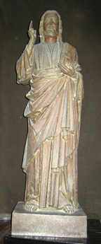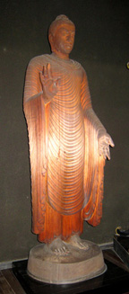 弘法大師像 福原先生は、さらに八聖人像作家の制作にあたっての手記についてたんねんに文献をさがし、それを紹介してくれました。その上で、個々の作品について美術史家としての立場から、感想を述べてくれました。一々の説明は出来ませんので、印象的だった点について2、3ご紹介いたします。まず清水先生のキリスト像です。清水先生はキリスト像の制作にあたって、キリストという人物をどのようにとらえるか、さらにその像を造る上でのヒントを得るため、可能な限りヨーロッパ各地の聖堂を歩かれたようです。その結果、初期ビザンチン、ロマネスクにも素朴でいいキリスト像があったけれど、ゴシック様式のものがもっとも厳粛で傑出しており、とりわけフランス北部アミアンのノートルダム大聖堂正面の像がもっともふさわしいとそれを典拠されたそうです。同聖堂の写真も見せてくれましたが、左手に聖書をいだき、右手の2本の指を立てて語りかける姿からは、わたしは弟子や信者に対するキリストの祝福と力つよい説得を感じています。田島亀彦さんの釈迦像は、一見して京都清凉寺の釈迦如来立像に規範を求めたことを思わせます。この像は、平安中期、宋から請来したインド様式のつよい仏像で、いわゆる清凉寺式釈迦として鎌倉以降全国的に分布した像の姿です。薄い衣の流麗な曲線の重なり具合など、まさに清凉寺式釈迦ですが、福原先生は「田島はその根源をインドの様式に求めている」として、ガンダーラ様式・マトゥラー様式の釈迦如来立像の写真でそのことを説明してくれました。たしかに、横に垂れ下がった衣の縁に浮かびあがった模様はマトゥラー様式の像に見られるものです。これだけの像を彫れる田島は只者ではありませんが、彼の父親は京都の仏師で、幼いときから伝統的な木彫り技術をみっちりと仕込まれていたようです。余談ながら、彼が美校の木彫科を受験した際、いきなり3年次に編入されたそうですが、教える教授側もさぞびっくりされたことでしょう。なお、田島は伝統的な木彫り技術に満足することなく、朝倉彫塑塾で近代的なセンスも学び取っていたようです。弘法大師を担当した長谷川桝藏も朝倉の内弟子でしたが、元々が仏像を得意にしていたようで、弘法大師の像容の考証のために各地の寺を歩き巡ったようです。木造で造仏するというのは、いわばわが国の主流ともいえる伝統的な手法ですが、木は乾燥するとともに亀裂が生ずる厄介な素材だとも言えます。仏師はその点を考慮して、用いる材質、一木造か寄木造にするかなどに腐心して技を磨いてきました。前述した清凉寺釈迦像もじつは寄木造です。一木造で知られた南都大安寺の諸像も、亀裂を防ぐため、背面で内刳り(うちぐり)をして木心を取り除いています。あるいは埋め木などして亀裂を補修することもあります。長谷川は、台湾産のヒノキの巨木を用いましたが、亀裂は漆木屎(うるしこくそ)によって補修したようです。漆木屎とは漆の中に麻の繊維や香木を練り込んだもので、弾力性のある材料です。彼は古来用いられていた伝統的な技法に通じていたのでしょう。等身大の像を一木で彫った釈迦像、弘法大師像、とくに繊細なノミによる彫り跡、みごとな像です。福原先生もとくにその点を強調していたのですが、特別に許されて壇上へ上がり、像に手を触れることができる近さで彫り跡を確認できましたが、釈迦の衣の繊細な線、弘法大師の僧衣の魚の鱗を思わせるのみの跡、おどろきました。二人の作者の伝統的な彫刻技術に、塑造の技術が加味された造形技法で生み出された紛れもない一木の像、わたしは、そこに数多くの日本の仏師たちの域に達し、あるいはそれを超えたのではないか、の思いでした。
