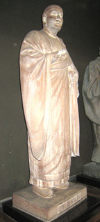 釈迦像 さて、ふたたび福原先生の講座の内容にもどります。講座では、まず用語として、日本古来の伝統彫刻としての彫刻(広義にはブロンズ鋳造なども含む)、洋風の彫刻である塑造、さらにその両者を合わせた彫塑(ちょうそ)の説明があり、日本では彫刻として美校開設時には日本の伝統美術である木彫が教えられたそうです。そして、のちにシカゴ万博に「老猿」を出品して、その精緻な表現で好評を博した高村光雲が木彫科の教授に就任したことで、衰退していた日本の伝統木彫が再興したようです。光雲の長男光太郎も美校への入学は木彫科でしたが、彼はロダンの作品を写真で見て洋風彫刻に触発され塑造の道へ進みますが、追っかけるように美校に塑造科が設立され、朝倉文夫、北村西望などを生み、母校で後進の指導に当たることですぐれた彫刻家が育てられ、塑造作家は木彫作家を凌駕するようになったようです。前述したように、八聖人像は、その当時のすぐれた作家の手による作品ですが、朝倉本人を含めて、釈迦の田島、日蓮の日名子、弘法大師の長谷川、親鸞の長谷と5人までが朝倉系の作家です。しかも、釈迦像、弘法大師像は木造で、本来わが国伝統の木彫りであるにもかかわらず、二人とも朝倉の弟子だったという点、興味のあるところです。ちなみに朝倉系に属さない作家は藤川、西村、清水の3人で、藤川は晩年のロダンの直弟子であり、西村は朝倉とともに美校(東京芸大)で教鞭をとっていた立場であり、清水はロダンのパートナーであるブールデルの弟子だという錚々たる作家であったので、当然と言えば当然だったのでしょう。