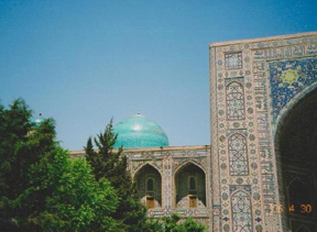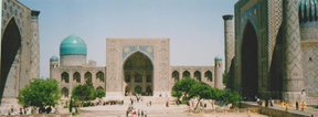 しかし、サマルカンドはよみがえりました。チンギス汗によって壊滅されてから約150年後にチムール帝国が誕生し、帝国の首都に定められたのです。チムール大帝は、アフラシャブの丘を棄て、丘を下ったレギスタン(タジク語で「砂地」の意)を中心に都市を復興していきました。サマルカンドが今日見られるような姿になるまでは、チムールの没後200年余りかかったといわれています。ご存知の方もいらっしゃるかも知れませんが、サマルカンドはいろいろな呼称で呼ばれています。曰く、「青の都」、「東方の真珠」、あるいは「イスラム世界の宝石」などなどです。たしかに、サマルカンドの抜けるような空の青さ、その青さに挑むかのように輝く青いドームとタイルの壁面、レギスタン広場に立つと、まさに目映いばかりの「青の煌(きらめ)き」です。その美しさは、広大なイスラム世界の中にあっても、イスラム芸術を代表する宝だといえるでしょう。