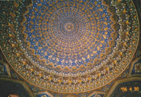 レギスタン広場を囲むように3棟のマドラサ(神学校のこと)が建っています。中央の建物がティラカリ・マドラサです。3棟のうち一番新しく、1660年の建設とされています。ティラカリ(タジク語で「金箔されている」の意)と名付けられた通り、内部礼拝堂の天井は金箔で仕上げられており、まばゆいばかりです。ドーム下から上を見上げますと、天井はドームに沿って丸みを帯びたように見えますが、驚くことに、じつは平面仕上げで、遠近法を巧みに利用して丸みを帯びたように見せているのだそうです。見事としか言いようがありません。サマルカンド市内の建物群は、レギスタン広場だけではありません。市内でも際立って大きく見える独特なドームをしたグリ・アミール廟、ここにはチムール大帝をはじめ一族が眠っています。この他にも中央アジア最大といわれる壮大なビビハヌム・モスク、11の廟からなるシャーヒズィンダ廟群など、何れをとっても壮大で華麗な建物ばかりです。