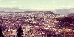・首都キト―海抜4878メートルの秀麗なる山容を誇るピチンチャの裾野2830メートルの高地にある都市で、市内を赤道が横断している。キャンプに関する顧客との打合せ、キャンプ内の建物(製油所竣工後は顧客の宿舎に)を設計する事務所との打合せなどのため、みすぼらしいところへは泊まれないと見栄をはって、市内で一、二位を競う高級ホテルColonに陣取った。1500$の外貨を持ち出していたので、はじめのうちは事務の人と同宿で気持大きく、夜な夜なレストラン通いをしていたが、そのうち懐が不安になり、のちに会社の定宿となったホテルEmbassyに移った。中級の中レベルではあったが、清潔感のあるホテルだった。キトではS商事のT氏が工事用に独立した事務所をすでに構えており、仕事上でも、個人的にもたいへんお世話になり、いまでも賀状を交換している。