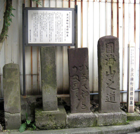 金沢横丁、4基の道標 京浜急行金沢八景は、文字通り景勝地金沢八景の玄関口で、駅の東側は国道ひとつ隔てて平潟湾に面し、西側には六浦の山が迫っています。駅のホームからは古い茅葺屋根の旧円通寺の建物が見え、山の中腹には古めかしい墓所も見えかくれし、この辺りだけは往時の歴史を感じさせる雰囲気を持っています。駅を出て線路沿いを少しく南下すると線路をくぐるガードがあり、そこを抜けますと、山を背にこじんまりした住宅街が開けます。古来「オヤシキ」と呼称された谷(ヤツまたはヤト)で、米倉家はここに陣屋を構えました。この時代、戦に備える必要はほとんどなかったでしょうが、周囲は三方を山に囲まれた天然の要害の地で、海に向けて開けた東側に海水を取り込んだと思われる堀を開削し、その内側に柵と東御柵門が設けられていました。表門は隣接する上行寺(鎌倉へ向かう日蓮が上陸したところ)から泥牛庵に連なる山を切り通し、鎌倉へ通じる六浦道に面しています。忠仰は陣屋東南隅の泥牛庵(臨済宗円覚寺派の寺)の「お茶山」と称されていた高台をたいそう気に入ったようで、ここへ登れば風光明媚な金沢の海を眼下に望むことができ、しばしば茶席などを設けていたようです。丈夫でなかった忠仰にとっては、そのひとときが一番の至福の時だったのではないでしょうか。