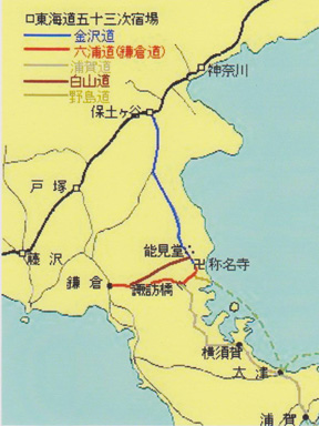金沢周辺交通図 ご存じのように、大名には参勤交代の制度が課せられていました。通常は1年毎に在府・在国を繰り返すわけですが、関東の譜代大名は半年単位でのローテーションになっていたようです。米倉家は、若年寄や大番頭といった幕府の要職についていた関係で江戸に在府することが多かったと思われますが、それでも、国元金沢へもどることもあったでしょう。その際の大名行列はどの道を通ったのでしょうか。米倉家の上屋敷は牛込御門の内側、江戸城外堀に面したところにありました。江戸城の北側の守りのために多くの旗本屋敷があったところで、米倉家の屋敷の周囲は大身の旗本屋敷に囲まれていましたから、多分、大名になっても旗本だったときに幕府から拝領した屋敷をそのまま使用していたのではないでしょうか。上屋敷を出て、品川宿へ出るまでの府内の道はいろいろあったでしょうが、品川宿からの道ははっきりしています。保土ヶ谷宿までは東海道、そこからは横にそれて金沢(かねさわ)道を南下するわけです。当時の大名行列のスピードは1日30〜40キロだとされていますから、上屋敷を早朝出立すれば、保土ヶ谷宿(品川―保土ヶ谷間約24キロ)でちょうど1日ということになるでしょう。保土ヶ谷からの金沢道は宿の中ほど金沢横丁で東海道から離れますが、六浦の陣屋まではやはり1日の行程です。宿を出てすぐ磐名(いわな)坂の長い急坂を上り、清水ヶ丘をすぎれば井土ヶ谷で、そこからは弘明寺・上大岡・笹下・栗木と平地がつづきますが、中里の隨縁寺先からまた尾根筋へ上る山道にかかりますので、途中のんびりとは歩けなかったことと思います。しかし、ここまでくれば待望の能見堂はもうすぐです。能見堂からは、瀬戸の内海(内川入り江)が目に入り、洲崎をはさんで平潟の海、その先には夕照の野島が望めます。名にし負う金沢八景が一望できる地なのです。さぞかしホッとしたことでしょう。能見堂から谷津まで下れば金沢文庫。称名寺へ立ち寄るもよし、あとは内川の入り江に沿って南下し、瀬戸の夕月を望みながら陣屋へ到着するわけです。