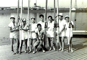 ボートのクルーとともに 夏になると思い出すことがあります。信じられないでしょうが、学生のころ荒川(現隅田川)でボートを漕いだことです。まさか!なんて思わないでください。べつに大学の漕艇部に入っていた、だなんてことは申しません。体育の実技でボートを選択し、夏の1週間、指導を受けたのです。場所は荒川区・東尾久の大学艇庫近くの荒川でした。艇庫は、いまは戸田の方へ移っていますが、この当時はまだ尾久にあり、隅田川も千住大橋から上流は荒川と称していました。現在は昭和40年の河川法改正で、荒川放水路と称されていた人工河川を荒川本流とよび、都民に親しまれている隅田川は岩淵水門まで隅田川と称し、じつは荒川の支流となっているようです。それはともかく、もう記憶はほとんど茫々としており、国鉄(現JR)の田端駅で下車したことは確かですが、そこから先は歩いたのかバス利用だったのか定かではありません。指導者(これから先はコーチと表示)は漕艇部の現役の学生さんで、いかにもボートマンらしく、日焼けした顔は精悍で、体つきも筋骨たくましく、はきはきとものを申す男らしい方でした。ただしその年、隅田川の春の風物詩である早慶レガッタに負けたということで、「くやしい!この憂さは君らをしごくことで晴らすのだ」と、そこまでは言わなかったかも知れませんが、とにかく悔しがっていました。早慶レガッタといえば、野球、ラグビーとともに三大早慶戦の一つであり、また、オックスフォードvsケンブリッジ、ハーバードvsイェールとともに世界三大レガッタと称されているだけに、8月の全日本大学選手権以上に勝敗にこだわるのだそうです。