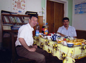 ウマル医師の病院へ着いたのは午後の4時でした。歩き始めから5時間を要したことになります。考えてみれば、その日タシケントのホテルを出立したのは朝の7時ですから、9時間も飲まず食わずにいたことになります。にもかかわらず、病院に着き、テーブルに用意されていたご馳走を見ても、食欲はまったくありませんでした。只ただ水分を摂りたいだけでした。しかし、2人のドクターの指示は、冷たい水分は絶対飲んでは駄目、また熱いお茶でも、紅茶は駄目で、彼らが勧めてくれたお茶を飲ませてくれただけでした。でも、人間、ほんとうに喉が渇いた時は、やはり何よりも冷たい飲み物がほしくなるものです。食欲のないわたしの様子を見て、彼らが勧めてくれたのは、白い液体でした。見た感じから、たぶん動物の乳であろうことはわかりましたが、あとから、それがクムスと称される馬乳酒だと教えられました。おっかなびっくり口にしたのですが、なんともいえず美味で、本当においしく、茶碗に3杯ほど飲み干しました。自分でも元気を取り戻していく感じがよくわかりました。そのあと、ウマル医師の診察室備え付けの簡易ベッドに横たわり、2時間ほどうつらうつらしていましたが、起きた時には元気は回復して、パンやラグマンと称するスープなども口にすることができるようになっていました。助かりました。あとで通訳に耳打ちされたのですが、もし回復が遅いようだったら、点滴で治療することもウマル医師は考えていたようでした。これも、回復後に知ったことですが、通訳の奥さまも病理学の学位を有する医師で、ウマル医師とは学友の関係だそうで、わたしのブハラ行きにあたって、何かあった時のことを考えて、彼女がウマル医師に依頼してくれたようです。わたしが休んだ部屋は彼の執務室兼診察室で、定かではありませんが、内分泌がご専門のようで、ベッド数200程度の病院の院長先生であり、わたしが横たわっている間も忙しげに部屋を出たり入ったりする気配をおぼろげに感じていました。病院を発ったのは19:30、もう日もかげり、そこから空港までの約40分は元気も回復して足取りも軽やかになっていました。ブハラ21:35発の便は予定通りで、タシケントのホテルへは11時前に着き、わたしの長い一日のブハラ旅行は終わりました。