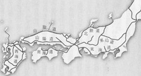 先生は、その著の中で「日本国」の成立は7世紀末で、弘仁14年(823年)には66カ国2島から成る国郡制を確立し、その制度は、明治以降、現代に至るまでほとんど変わっていないと書いています。そして、「日本国」は国を畿内(京都を中心に、今でいう首都圏)と七道の制度によって区別し、畿内を起点に東へ東海道、東山道、北陸道、西へは、山陰道、山陽道、南海道、九州の西海道の七道を計画的に造成したそうです。「道」は、国の広域的な行政区分であると同時に、実際の道でもあったというのです。しかもこの道は、計画的に造成され、道幅10数メートルに及ぶ直線道路で、一定の距離で駅を設置し、排水のための側溝があり、場所によっては路床をつき固めた、技術仕様でいえば、いわば重量物の往来に耐える道路であったようです。まさに、ローマやインカのクスコ同様、すべての道は首都である畿内へ結ばれる軍事的な目的で敷設された道だったのです。