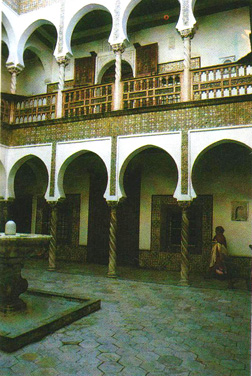アルジェ太守の館 上の写真は、アルジェ滞在中に市内の書店で購入した‘ALGERIE’という本に出ていた古い館の内部写真です。フランス語は読めませんし、訳してもらうのも煩わしいので、わたしのいい加減な意訳ですが、この館はカスバに現存しているもので、赤ひげが活動していた頃よりのちのアルジェ太守だったダル・アジィザ・ベンの館であり、それも太守の妃専用の館だったようです。イスラム建築特有のアーチと柱の形態、室内のアラベスク(壁面装飾)に使われている上質のタイル、噴水をともなったパティオ(中庭)など、この館は典型的なイスパノ・モレスク様式の建物(イスラム勢力が北アフリカからイベリア半島へ進出したころの様式で、スペイン・グラナダのアルハンブラ宮殿が著名 これに対してキリスト教と混交した建物はムデハル様式となる)です。アルジェには、この種の建物が幾棟か残っており、そのいずれもが国の重要建造物に指定されているようです。ベンガナの館も、だいぶ改修の手が入っておりますが、写真からも分かるように同じ様式の建物、しかも非常に格調の高い建物だといえるでしょう。アーチの美しい姿、室内に用いられたモロッコ産の青色(アラベスクの青は海を示す)を基調にしたタイル(一部建設当時の古いタイルも残っています)、そして写真には出していませんが、から草模様や幾何学的模様をモチーフにしたプラスター(漆喰)仕上げの白壁などが、そのことを物語っています。やや蛇足になるかもしれませんが、アラベスクのタイルに使われる色は青のほかに3色あります。ベンガナの館では青以外には黄金の象徴である黄色が使われているだけで、王の権力を示す赤、そして砂漠の民にとってあこがれである緑色は用いられていません。王ではない太守の館には赤は使えませんし、緑の豊富なアルジェには緑色も必要ないからです。そのように見てきますと、ベンガナの館に赤ひげが住んでいたという説、あながち否定すべきではないと思うのです。ましてや秘密の抜け道もあったというし、外観写真からもわかるように、城壁のような堅固な外壁に囲まれた館なのです。