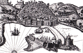 アルジェの古図 トルコ領になってから、アルジェはトルコ帝国皇帝の任命する太守(ベイまたはデイ)が統治しましたが、帝国に年貢こそ納めはしたものの、実質は自治領として大いに栄えました。上の図は、わたしがアルジェに滞在中に入手した本からコピーした18世紀後半の頃のアルジェの古図です。これによりますと、標高114メートルの丘の上にいく琉もの旗をなびかせた城があり、丘の中腹は城壁に囲まれた城下町が開かれ、湾内のペニョオン島には堅固な要塞が築かれていて、街から要塞へは一本の土手道(コーズウェイ)で結ばれています。一見して、湾内へは入りにくく、まことに防禦にすぐれた城砦造りになっていることがわかります。アルジェの争奪にあたって、イスラム・キリスト両軍がしのぎを削ったこと、よくわかります。また、図中、丘の中腹の城下の街が、位置的には現在のアルジェのカスバにあたっており、カスバが「城砦」を意味するアラビア語だということも、この図によってよくわかります。アルジェの太守たちはとうぜんそこに館を構えたことでしょう。信じる、信じないは、皆さまのご判断におまかせしますが、じつは、アルジェに滞在したその前半の何日間か、わたしはそんな館の一つ、「赤ひげの館」と称されている建物(現在はアルジェの大地主ベンガナ一族が所有する広大な敷地内にありますので、以下便宜的に「ベンガナの館」と仮称します)に住んだことがあるのです。むろん当初は、その館が海賊赤ひげの館だということ、まったく知りませんでした。知るにいたったのには、こんな経緯があったのです。