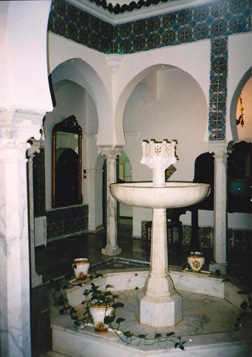 ベンガナの館パティオ とは申せ、異論もあるでしょう。まず何よりも、ベンガナの館はアルジェがトルコ領になったころ、17世紀初頭の建物だといわれています。もしその通りなら、16世紀半ばに活躍した赤ひげとは時代のずれが生じてしまいます。また、館が位置するのはベン・アクヌーンと称される丘陵地で、前掲のアルジェの古図でいえば丘の左手の奥、標高でいえば200メートルを超える高地です。アルジェ市内のカスバからは直線距離で4キロとかなりの遠方にあたります。これだけ離れると、敵艦の来襲という非常時を考 えれば、太守の館としては望ましい立地だとは思えません。しかし一方で、こんなことも考えられないでしょうか。実はバルバロサは固有の人名ではなくアラビア語で「赤ひげ」のことですから、「海賊赤ひげ」を名乗る者がウルージ・ハイルッディン兄弟以外にいてもなんら支障はない筈です。また、赤ひげはモスレムです。さなくとも、第4夫人まで持てるのですから、太守ともなれば、ハーレム的な館はいくつあってもあり過ぎることはなかったでしょうし、緑豊かなベン・アクヌーンの丘に建つ館は別荘にしていた、なんてことも十分考えられるでしょう。抜け道にしても、ベンガナの館の近隣には、同時代に建設されたと思われるいくつかの館も点在していますから、それらの館との相互連絡用(非常時の避難など)に秘密の通路があったと考えることも、かなり蓋然性に富んでいるのではないでしょうか。今さら16、7世紀の昔にさかのぼって、赤ひげの館だったとか、いやそんな筈はなかろう、などと論じてもまったく詮無きことで、どうせならば、往時名を成したオスマン帝国海軍提督バルバロス、またの名は「海賊赤ひげ」が住んだことのある館に、自分もしばし住んだことがあるのだ、と考える方が楽しいではありませんか。わたしはそんなロマンにひたっています。 (2012年11月) |