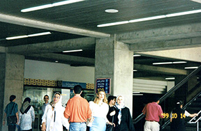 ショッピングセンターにて アルジェ市内の観光スポットの一つである戦没者慰霊塔(モ二モン)は小高いクリエールの丘にそびえている。そこには近代的なショッピングセンターがあり、映画館やレストランもあり、休日にはかなりの人出となるが、実際に買い物をしている人を見かけることは少ない。女性の服装を見ると、フランスの影響を受けた洋装の人と、敬虔なモスレムとが違和感なく混交している。写真のアングルがおかしいのは、目立たぬように下から撮っているためである。