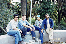 現場で休憩中のレーバーたち 現場で働いていたのは多くは電工で、山岳地帯からのベルベル人であった。総じてまじめで、器用であった。右端の人物は調子がよく、一人おいたいかにも真面目そうな青年は、日本の職人さんたちから最も信頼されていた人物であった。