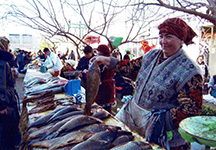 サマルカンドの市場にて サマルカンドで寄ったバザールでの魚売りのおばちゃん。海のないウズベキスタン、すべて川魚であろうが、おばちゃん、「新鮮でおいしいよ!」と言わんばかりに、声を張り上げていた。 以上で、2回にわたっての「息抜きに」は終わりにいたします。 (2014年11月) |